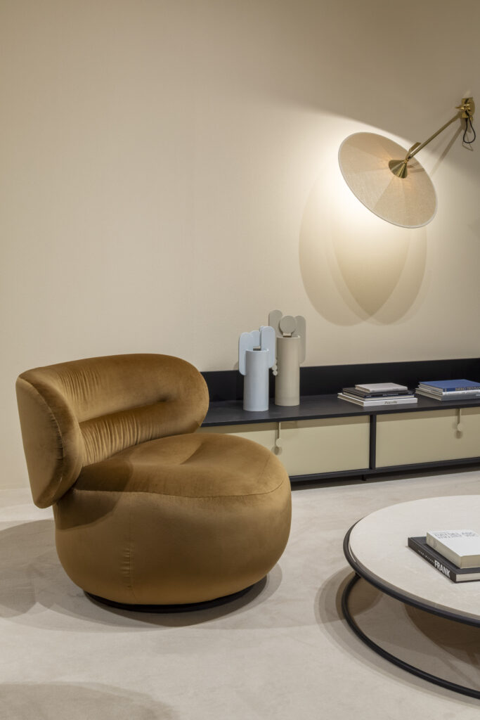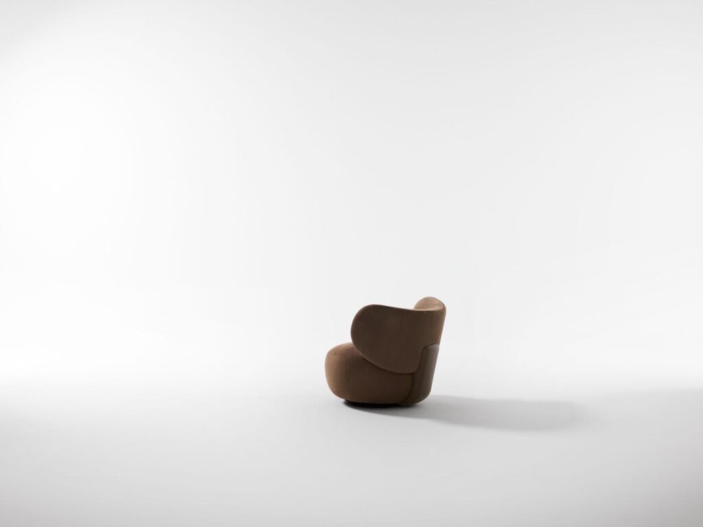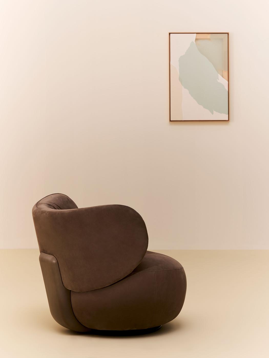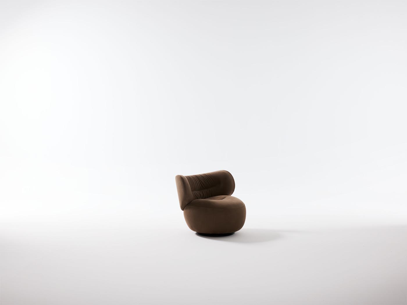 The organic design of the Amelie upholstered armchair, created by the Spanish designers Yonoh Studio, finds its expression in sinuous, rounded forms. Its distinctive feature is the gently reclined backrest, which offers reassuring, comfortable, enveloping support, while simultaneously redefining the concept of pure relaxation: free, without formalities. Soft and welcoming, the armchair moves imperceptibly, following and sustaining the backrest with its rounded lines. Also featuring a swivel base, Amelie is available in all the fabrics and leathers of the collection